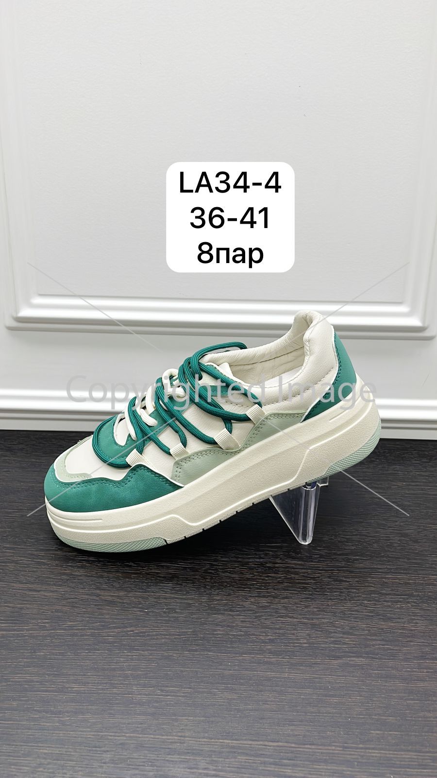 Модель выполнена из искуственной кожи и текстиля, в бежево-зеленом цвете. Размерный ряд от 36 до 41 размера. Минимальный заказ - 1 коробка, в коробке 8 пар.