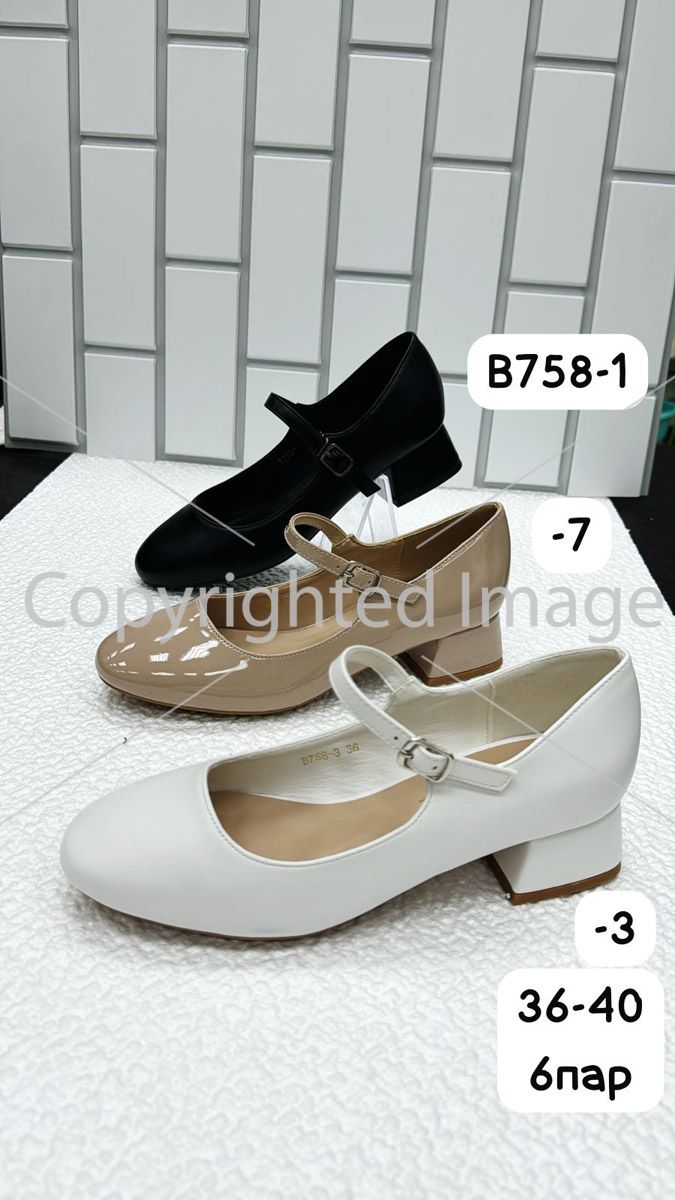 Туфли, в зависимости от модели, выполнены из искусственной замши / искусственной кожи / лакированной кожи в следующих цветах: черный, бежевый, белый, леопардовый, красный. Размерный ряд — от 36 до 40 размера. Минимальный заказ — 1 коробка, в коробке 6 пар.