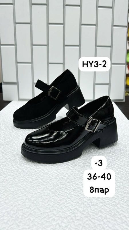 Туфли, в зависимости от модели, выполнены из искусственной кожи / искусственной замши в черном цвете. Размерный ряд — от 36 до 40 размера. Минимальный заказ — 1 коробка, в коробке 8 пар.
