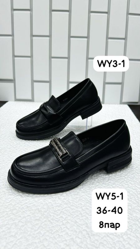 Туфли выполнены из искусственной кожи в черном цвете. Размерный ряд — от 36 до 40 размера. Минимальный заказ — 1 коробка, в коробке 8 пар.